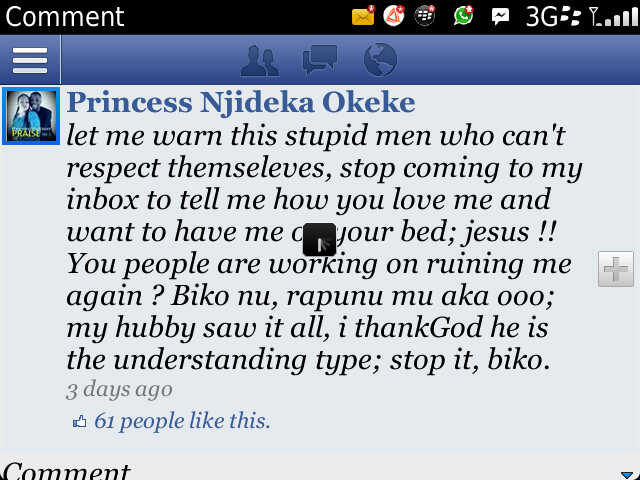 Singer Princess Njideka Okeke, popularly known for her gospel hit album ‘AkaNchawa’,  has cried out about the person impersonating her on Facebook, sending out messages and updates which causes her  friends to believe its from her.Speaking with Diamond Celebrities, she said:  “This  has been going on for a while now and its hard to convince my friends that the messages and updates are not from me because of the nature of the updates. According to her, the person updated the message below in order to make people believe its from her.”