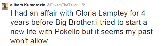 After fans thought their accounts were hacked, Elikem has come clean on twitter, admitting her had an affair for 4 years and his past won’t let him enjoy his relationship with Pokello…