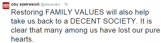 “Restoring family values will also help take us back to a descent society. It is clear that many among us have lost our pure hearts.