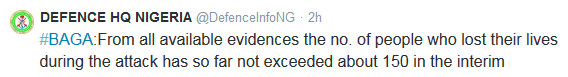 “From all available evidences, the number of people who lost their lives during that attack has so far not exceeded about 150 in the interim. This figure includes many of the terrorists who were bearing arms and got killed in the course of their attack and battle with troops,” Mr. Olukolade said.