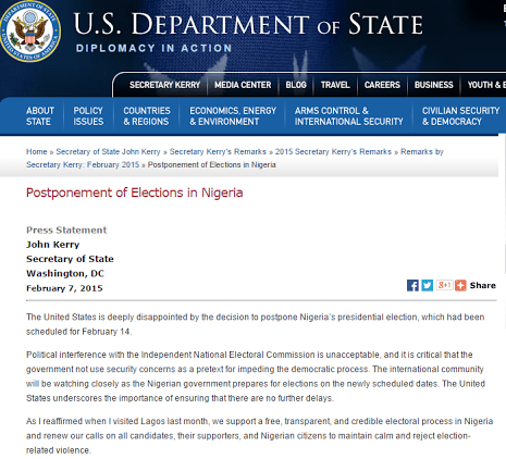 A statement by U.S. Secretary of State, John Kerry, shortly after the announcement of the poll shift by the Chairman of the Independent National Electoral Commission, Attahiru Jega, on Saturday, said political interference with INEC is unacceptable.