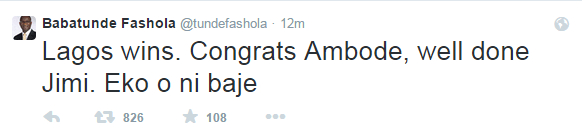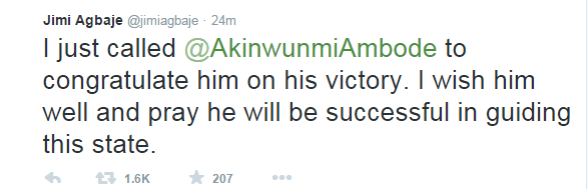 The APC opposition candidate, Mr. Akinwunmi Ambode received a call from Mr. Agbaje at 6:50pm Sunday evening. In the call Mr. Agbaje promised to work with his administration for the prosperity of Lagos State in the next four years.