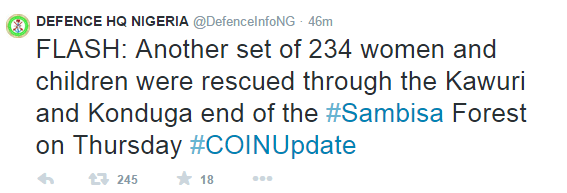 Nigerian military on Friday said another set of 234 women and children have been rescued by troops in Borno State.