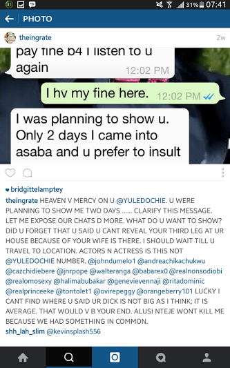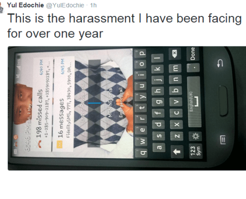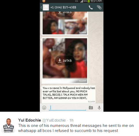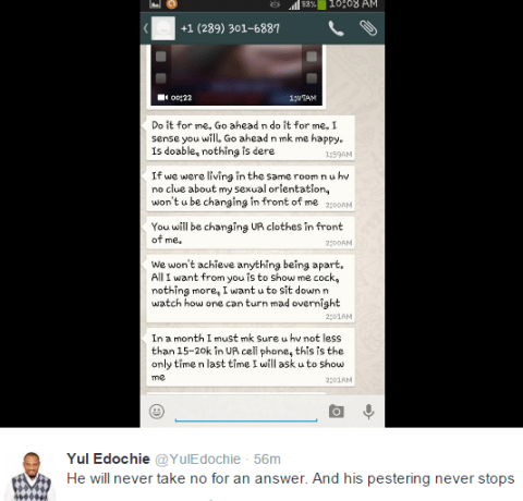 “A few yrs ago this boy Steve Ugochukwu Onyebuchi, based in Canada contacted me on Facebook and asked me out. I told him i’m not gay. I’m married. Leave me alone. Later I started getting calls from him, he said he has friends in Nollywood who always get him any number he needs. I blocked all his numbers. After a very long time he started calling me again, and sending me messages on whatsapp. He said he went on the internet and learnt how to call people with different numbers on one phone, so I cant block him anymore.
