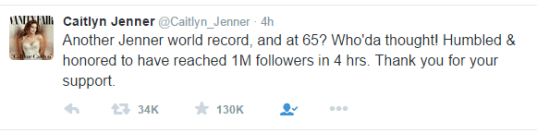Caitlyn Jenner has apparently become the fastest person to reach 1 million followers on Twitter.