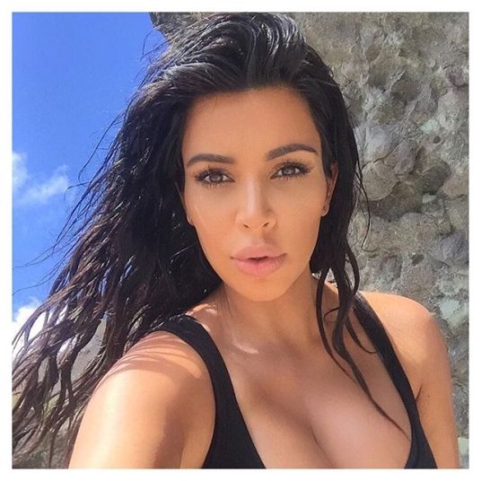 Kim Kardashian West may be back from her St. Barths vacation, but the star is still sharing ton of selfies from her tropical family getaway, showing off her lips and cleavage.