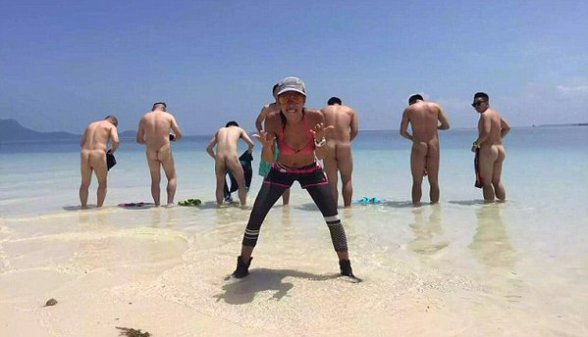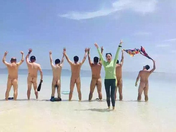 In one of the photographs, a woman in a swimsuit makes a face to the camera while four men behind her stand naked facing away.