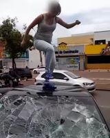 First she smashes the windscreen until it’s barely attached to the rest of the car, and then she jumps up and down on the roof. Finally, she throws a rock through the back window.