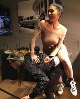 But she didn’t look too bothered, laughing as she balanced her phone and a bunch of grapes in one hand while placing another on her model pal’s back.