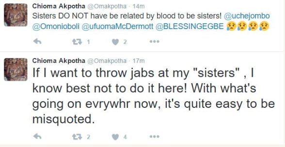 After we (Diamond Celebrities) called Chioma Chukwuka and Uche Jombo out again today, via their various Social Media accounts, based on their yesterday’s drama… Chioma has now cleared the air based on their assumed beef.  Read it here & here