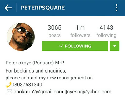Peter Okoye has updated his Instagram bio, adding the stage name “Mr P” and contact information of his new management.