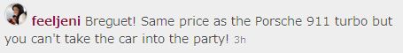 Bragging about the watch, she wrote, “Breguet! Same price as the Porsche 911 turbo but you can’t take the car into the party!”