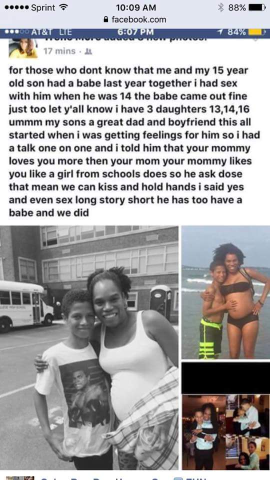 “For those who don’t know, me and my 15 year old son had a baby last year together. I had sex with him when he was 14 years old. The baby came out fine. Just to let you know, I also have three (3) daughters who are thirteen (13), fourteen (14), and sixteen (16).