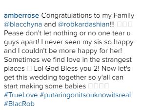 Sharing a picture to Instagram showing the loved-up couple flashing beaming grins, she wrote: “Congratulations to my family @blacchyna and @robkardashian!!!