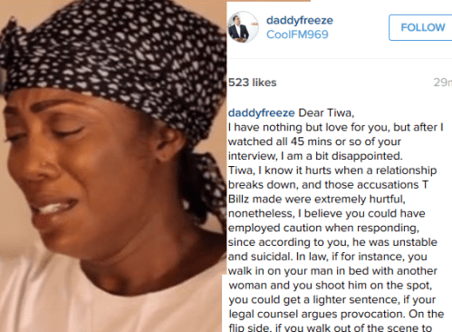 Cool Fm OAP, Daddy Freeze has weighed in on Tiwa Savage’s tell-all interview where she revealed a lot of secrets about the breakdown of her marriage to TeeBillz, He wrote: