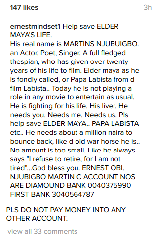 Veteran Nollywood actor, Martins Njubuigbo has been diagnosed with Liver disease. According to actor Ernest Obi who posted the story and picture online, the old man needs financial assistance and wants Nigerians to come to his aid…