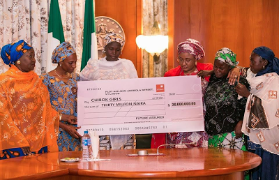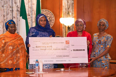 Mrs. Buhari presented a cheque of N30 million to parents of the Chibok girls and N25 million cheque to parents of the Buni Yadi boys.