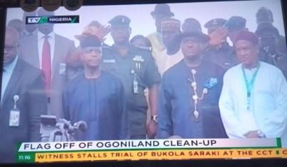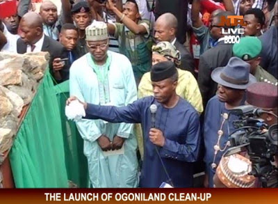 Vice President Yemi Osinbajo is now at Ogoni land for the flag-off of the Niger Delta cleanup exercise, polluted by years of oil exploration and production. Singer Muma Gee, Joseph Yobo and others are all present at the flag-off ceremony.