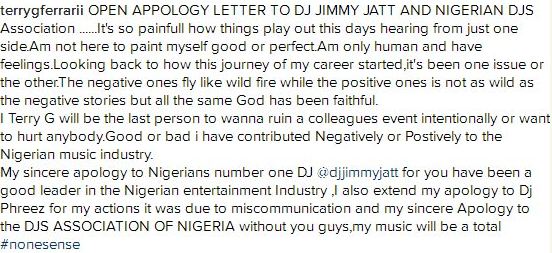 “This must be the kind of thing that makes God to say, we should forgive our brothers the way he ‘God “forgives us. I appeal to d great DJ association of Nigeria, to please forgive our brother terry G. We are all one in this industry, we all know that terry G is not a bad person, and we all know that shit happens sometimes. At Jimmy Jatt, we love u bro. Bleeeeesssssss”. She sent to us.