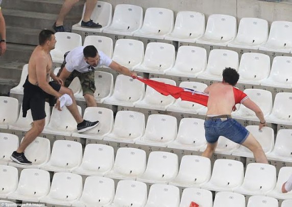 Violence spilled onto the terraces in Marseille as fans brawled with each other in the Stade Vélodrome after England’s draw with Russia.