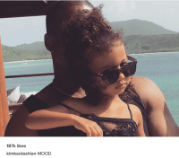 The toddler is seen staring down the camera in some huge sunglasses, as she soaks up some sun in Kanye’s arms.