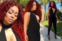 The pregnant mum-of-one was clearly keen to show off her sexy side as she posed up a storm in a plunging black jumpsuit.