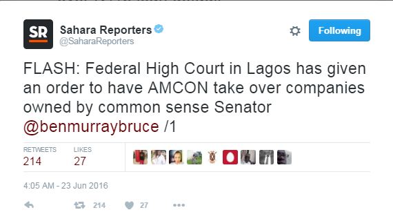 According to a tweet by SaharaReporters, the court has granted AMCON an order to take over companies owned by ‘common sense’ legislator for owing N11bn.