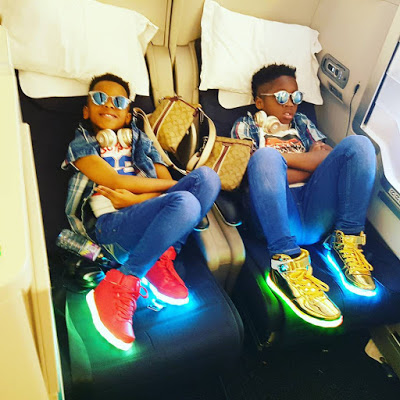 The chairman Five-star Music Label shared new pics of his kids as they jetted out of Nigeria for the holidays. Elegantly kitted for their trip, they posed in their Business class cabin too.