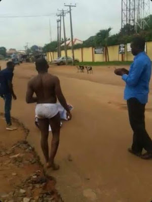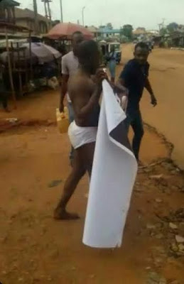 A ‘Man of God’ by name Prophet Obi O. of Anchor of Restoration Church located at Owufuju Street, Asaba, was this morning stripped to his underwear by the people who caught him red handed allegedly having sex with a married woman. He was made to hold his church banner while being paraded around in his underpants.