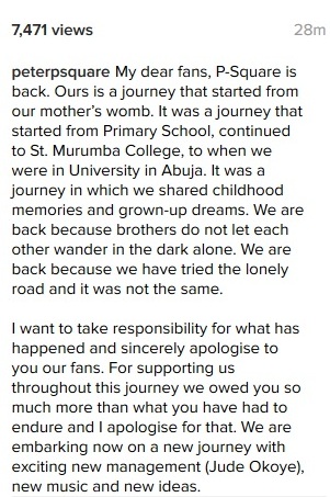 “My dear fans, P-Square is back. Ours is a journey that started from our mother’s womb. It was a journey that started from Primary School, continued to St. Murumba College, to when we were in University in Abuja. It was a journey in which we shared childhood memories and grown-up dreams. We are back because brothers do not let each other wander in the dark alone. We are back because we have tried the lonely road and it was not the same. I want to take responsibility for what has happened and sincerely apologise to you our fans. For supporting us throughout this journey we owed you so much more than what you have had to endure and I apologise for that. We are embarking now on a new journey with exciting new management (Jude Okoye), new music and new ideas. We cannot thank you enough for all your prayers and support throughout this difficult period. Maya Angelou once said that brotherhood is a condition that people have to work at. We will continue to work on that and you can be prepared to be blown away by this new phase of P-Square. God bless you all and be assured that you have not seen anything yet! Peter Okoye P-Square”