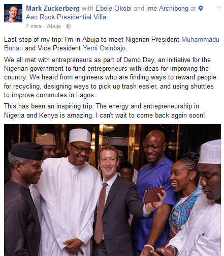 Mr. Zuckerberg, 32, returned to the country to participate in the Aso Villa Demo Day, an event organised by the Buhari administration for Nigerians to showcase their ideas for possible investment support from the government.