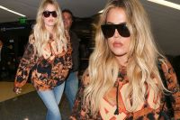 She was dressed in a slouchy orange and black hoody with tight jeans and stylish black ankle boots for her trip.