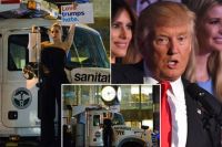 She stood outside Donald’s building on top of a sanitation truck, wearing all black with the stars and stripes flag tucked into her outfit as she held up a sign that read: “Love trumps hate”.