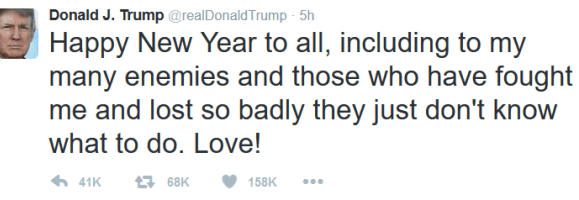 “Happy New Year to all, including to my many enemies and those who have fought me and lost so badly they just don’t know what to do. Love,” Trump tweeted.