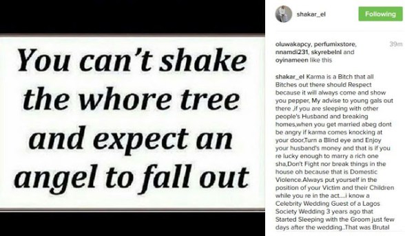 ‘Karma is a Bitch that all Bitches out there should respect because it will always come and show you pepper. My advise to young girls out there, if you are sleeping with other people’s husband and breaking homes, when you get married abeg don’t be angry if karma comes knocking at your door’. Read his full post below…