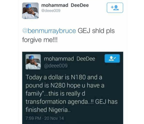 “Today a dollar is N180 and a pound is N280. Hope you have a family… This is really the transformation agenda. GEJ has finished Nigeria,” Mr. Deedee, who tweets from the handle @deee009, posted at the time.