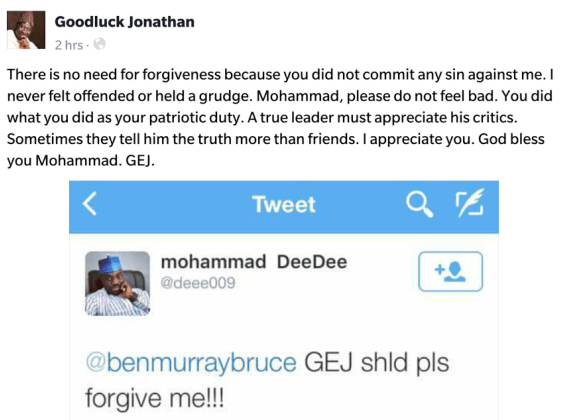 Mr. Jonathan was reacting to a tweet by one Mohammad Deedee who asked the former president to forgive him for criticising him on November 20, 2014, when the Nigerian naira exchanged for 180 to a dollar and 280 to a pound.