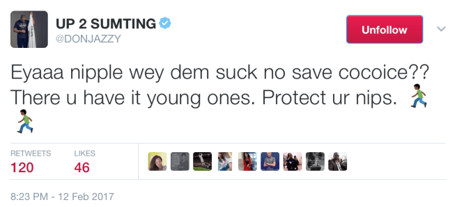On Saturday nite, Big Brother Naija housemate Bassey sucked fellow housemate, Coco Ice’s boobs…And Don Jazzy tweeted this after Coco Ice was evicted from the house.