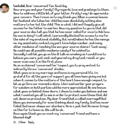 What goes on in my marriage and home is my personal life, i’m grateful for all the years of support you all have been giving me but when it comes to the matters of the heart have enough respect to let us go thru our moments alone.. Like I said earlier your prayers for wisdom on both parties wld be more appreciated. No one knows what goes on behind close doors…I chose to make you believe and see what I wanted you all to see in order to protect even those that did not deserve protection. My dear friend that’s called marriage!!! God bless you immensely for even thinking about my family, God has never failed, God never sleeps nor slumbers, He is a just God. He never brings us this far to leave us, We will be ok.. Once again thank you so much my “concerned” friend and have a blessed day!!!”