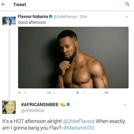 The Ada Ada crooner had posted a photo of him topless on his Twitter page after which the controversial queen quickly commented by asking when will the singer ‘bang’ her.