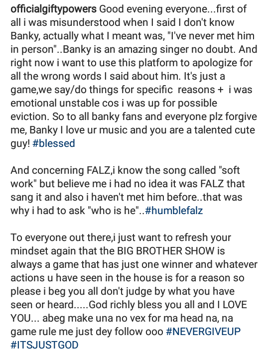 Gifty u later apologizes to banky w & falz mm thats good sha.