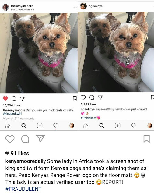 US reality star, Kenya Moore called her out yesterday for stealing her puppy photo and passing it off as hers on Instagram… Oge has since deleted the photo from her page after she was called out and disabled comments on her last 3 photos, as Nigerians continue to stone her with bad words!