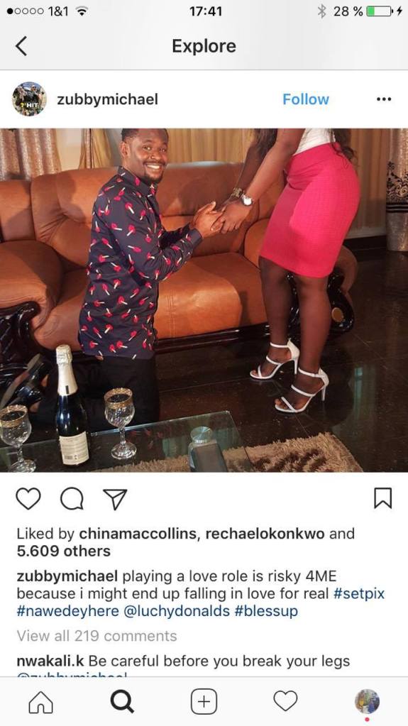 Nollywood Actor, Zubby Michael has disclosed that playing love roles in movies is very risky for him, because he might end up falling in love for real. Now, we understand why Brad Pitt and Angelina Jolie fell in love on set… We can’t blame him, who will not fall in love with this beautiful girl? lol