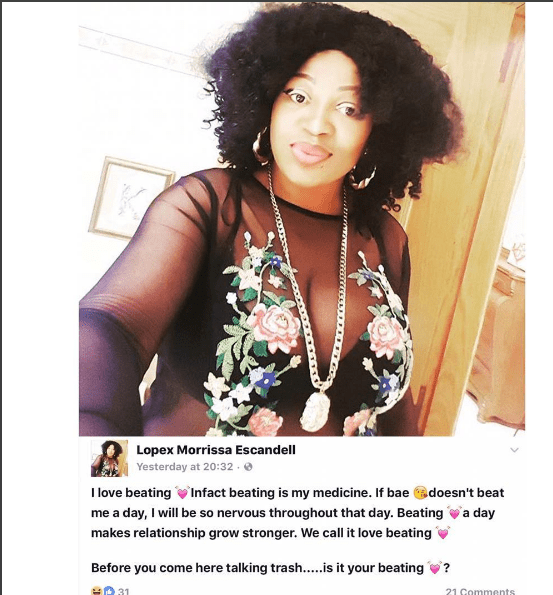 “I love beating 💓Infact beating is my medicine. If bae 😘doesn’t beat me a day, I will be so nervous throughout that day. Beating 💓a day makes relationship grow stronger. We call it love beating 💓Before you come here talking trash…..is it your beating 💓?” She wrote on her Facebook page.