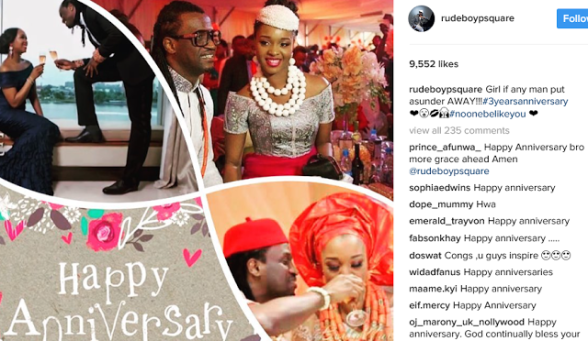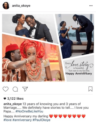 Paul Okoye of P-square and his lovely wife, Anita, who have been together for 13 years, are celebrating their 3rd wedding anniversary today. The couple got married on Saturday, 22 March 2014 and are blessed with a son, Andre. They both took to their Instagram pages to wish each other a happy wedding anniversary.