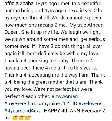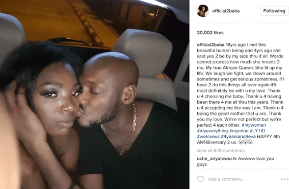 2baba and wife, Annie who have been together for 18 years, married for 4 years are celebrating their 4th wedding anniversary today. They both took to their Instagram pages to wish each other a happy wedding anniversary. The couple had their star-studded wedding in Dubai, on Saturday 23 March 2013.