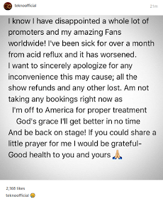 “I know I’ve disappointed a whole lot of promoters and my amazing fans worldwide. I’ve been sick for over a month now from acid reflux and it has worsened. I want to apologize for any inconvenience this may cause; all the show refunds and all the loss. “I’m not taking any bookings now as I’m off to America for proper treatment. By God’s grace I’ll get better in no time and be back on stage. “If you could share a little prayer for me I’ll be grateful. Good health to you and yours”, he wrote.