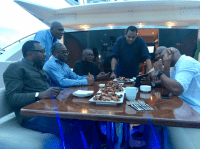 ….From left is Femi Otedola, Segun Awolowo, Charles Ahize, Aliko Dangote, Donald Duke, Tunde Ayeni and Sam Nwajoku, all on Dangote’s yacht Sunday to celebrate Sallah.