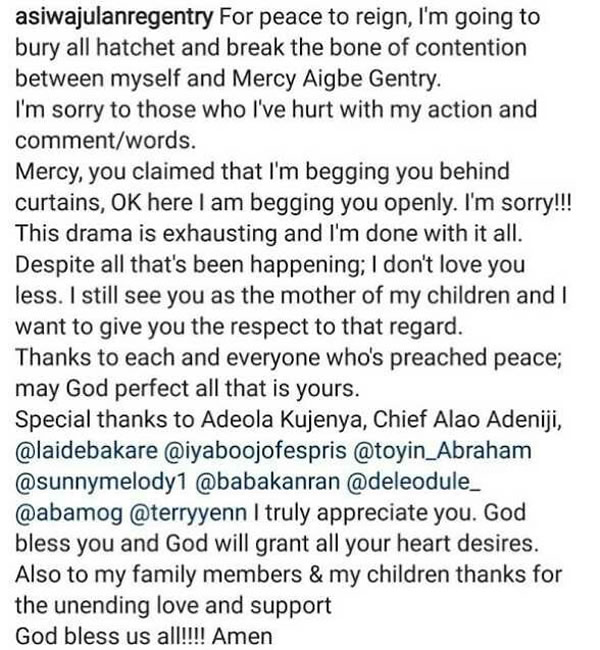 Mercy Aigbe’s estranged husband, Lanre Gentry, has publicly apologised to her, adding that he was tired of the negative publicity and wanted to bury the hatchet.