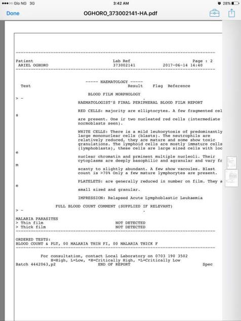 “The time, money spent, intense prayers and treatment eventually paid off, she had recovered, all tests indicated she was in remission, she was returning to school to try and make up for the lost time during treatment, Ariel was totally free from Leukemia, this is a miracle, and at last everything will return back to normal”……… at least this what we all thought. But unfortunately, a relapse occurred!